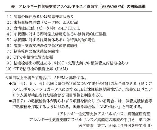 従来のABPAの診断基準は特異度は高く、それが当てはまれば診断は間違いないと言ってよかったのですが、診断基準に当てはまらないけれども、ABPMらしいという患者さんがたくさんいたんですね。そういった方について診断ができ、かつ特異度も落とさないような診断基準が、私たちが2019年に提唱したものになります(表)。