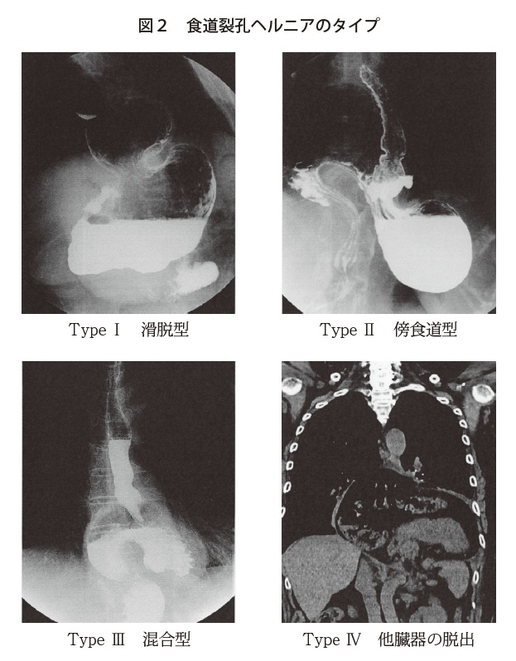 食道裂孔ヘルニアは大きく分けて4つのタイプがあります(図2)。TypeⅠは滑脱型といって、上にだけ出るタイプ。TypeⅡは傍食道型といって、食道胃接合部の位置は通常の位置にありますが、その横から出てしまうタイプ。TypeⅢは混合型で、上と横に出てしまうタイプ。TypeⅣは、胃以外の臓器、一番多いのは横行結腸ですが、横行結腸や大網、ひどくなると脾臓、すい臓が出てしまうものもあります。