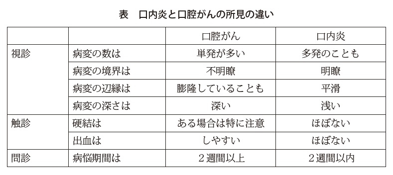 非常に大切だと思います。一般的な口内炎、アフタ性の口内炎であれば硬いということはまずありませんので、触ってみて硬い、膨隆している、そして易出血性であれば、扁平上皮がんの可能性があると思っていただいていいと思います。