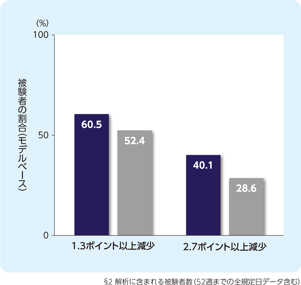 本試験におけるレスポンダーの定義に用いた1.3及び2.7ポイント以上の減少は、海外第Ⅱ相試験(012試験)のPGICの解析結果5)に基づき設定した。
