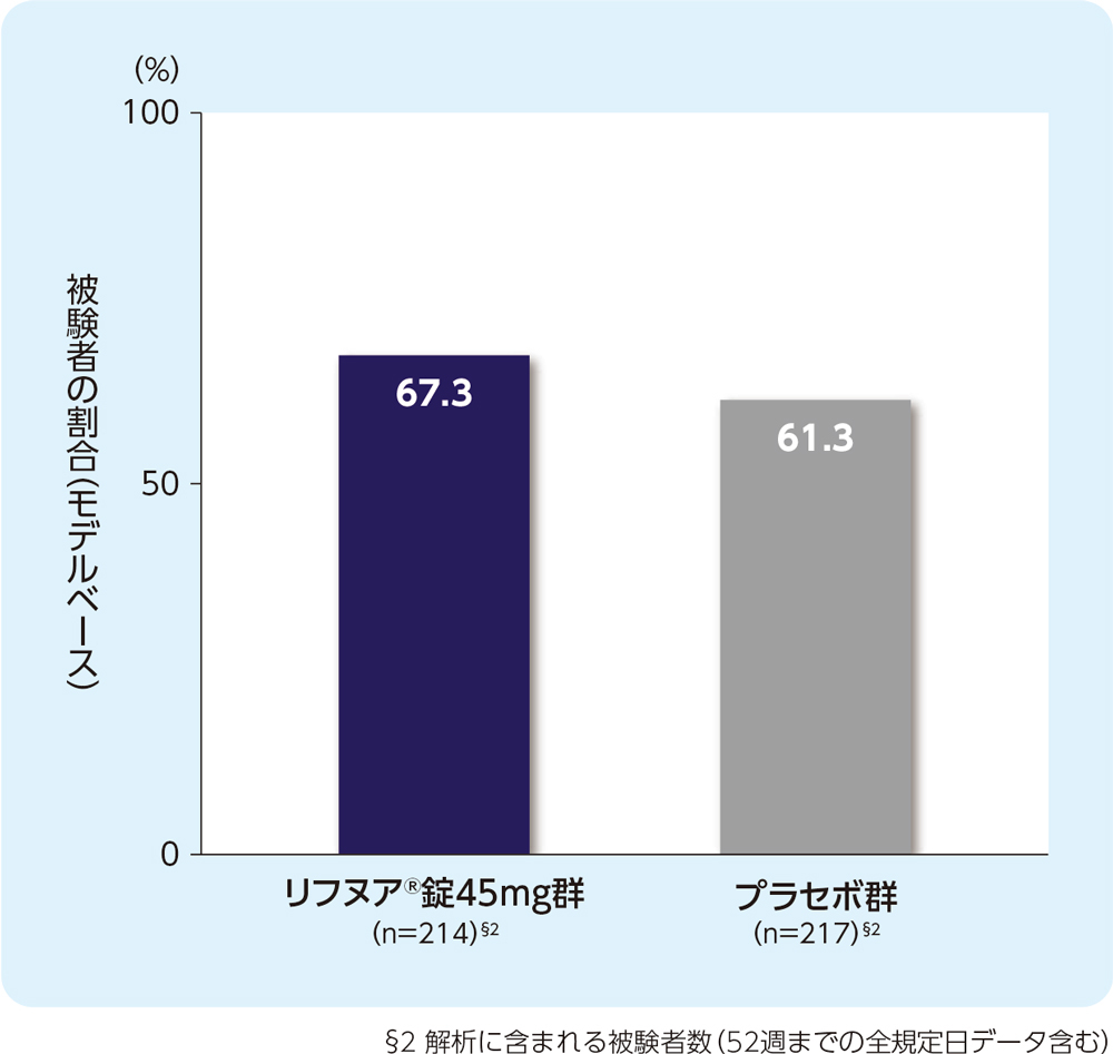 12週時のLCQ合計スコアがベースラインから1.3ポイント以上増加した被験者の割合は、リフヌア®錠45mg群で67.3%、プラセボ群で61.3%でした。
