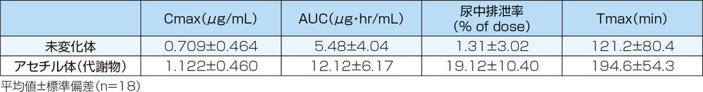 尿中排泄率は、投与量に対して未変化体1.31%、アセチル体(代謝物)19.12%で、尿中総排泄率は20.44%でした。